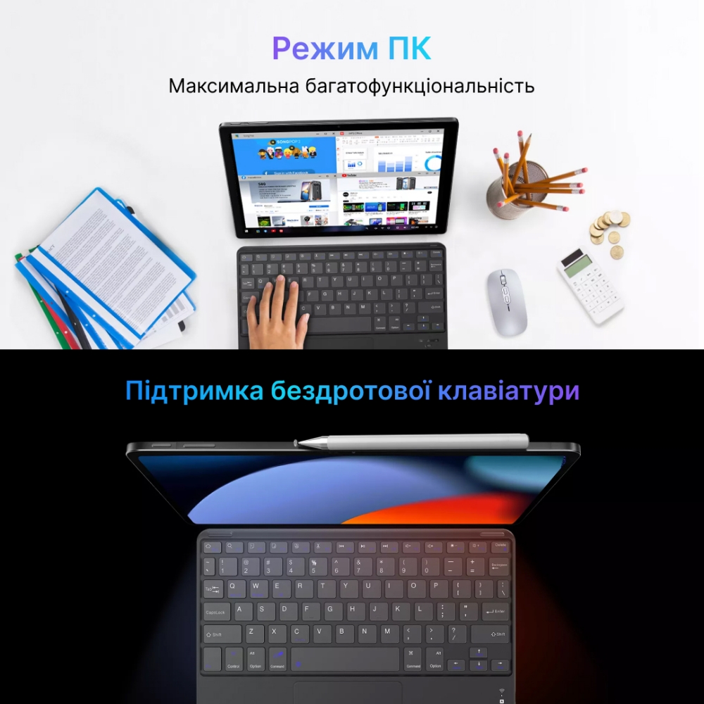 Розширений режим ПК на Oscal Pad 16 перетворює планшет у повнофункціональний міні-комп'ютер, що забезпечує високий рівень ефективності в мультизадачному середовищі. Використання бездротових клавіатур, що підключаються через Bluetooth або Wi-Fi, значно покращує якість роботи з планшетом.