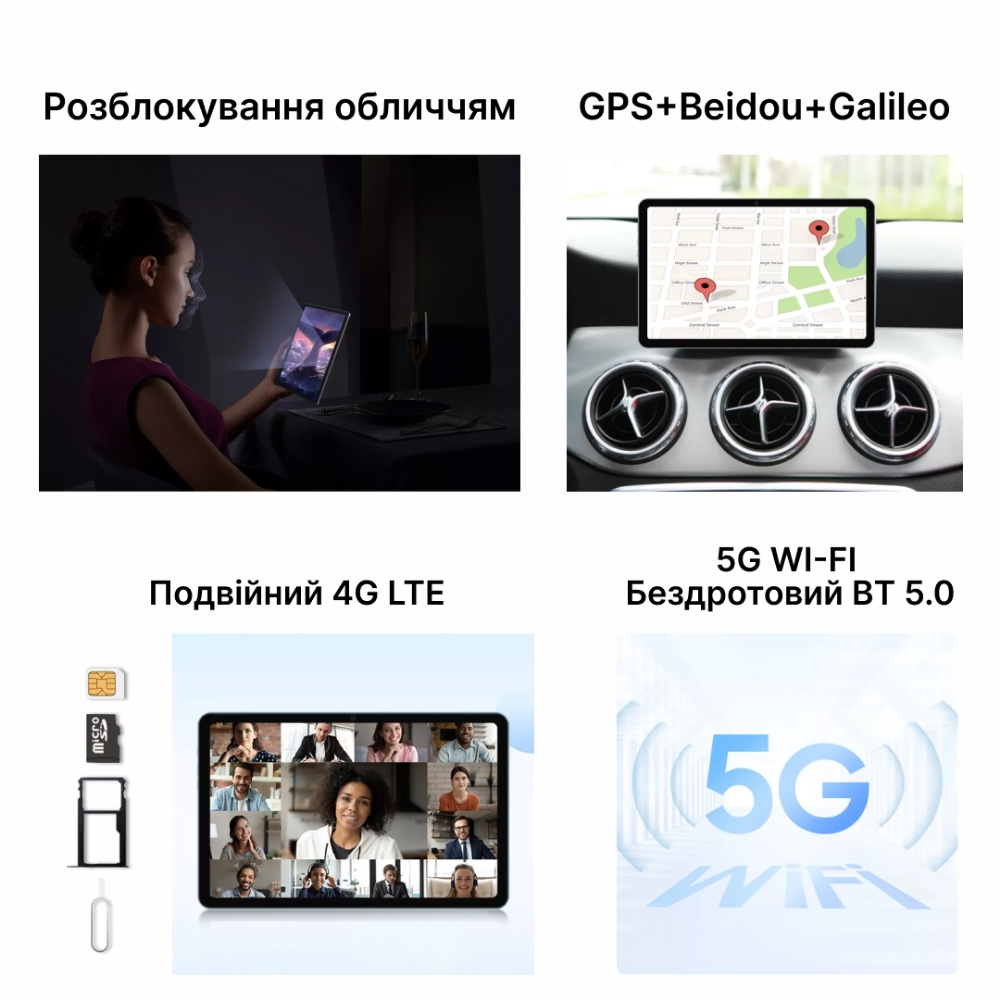Oscal Pad 16 підтримує останні технології з'єднання, включаючи 5G Wi-Fi та Bluetooth 5.0, що забезпечують швидке та стабільне підключення до мережі. Планшет також оснащений слотом для двох SIM-карт для гнучкого вибору операторів зв'язку. Методи розблокування включають у себе розпізнавання обличчя, забезпечуючи додатковий рівень безпеки та зручність використання.