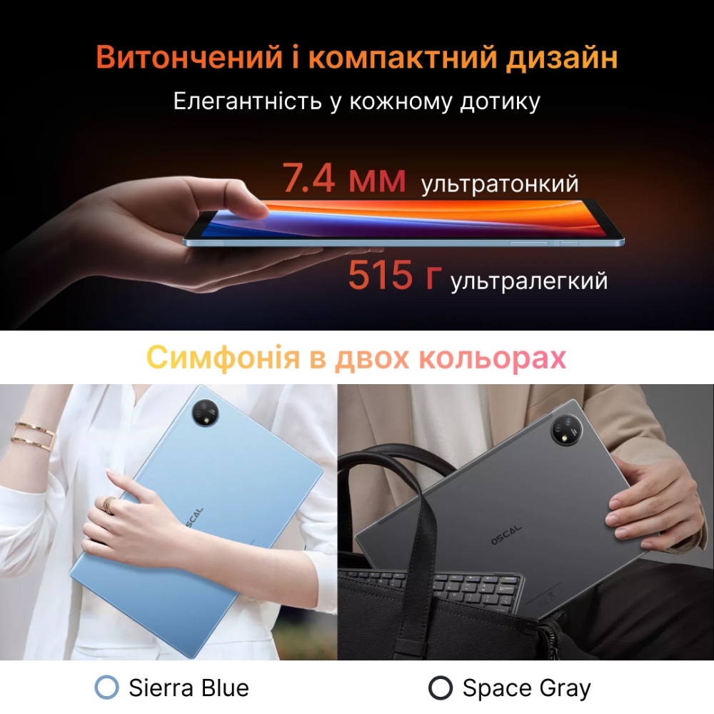 Планшет Oscal Pad 16 вирізняється своєю ультратонкою конструкцією, яка має товщину всього 7,4 мм, та вагою 515 г, що робить його одним із найлегших пристроїв на ринку. Дизайнерський підхід поєднує елегантність і зручність, а варіанти кольорів - Небесно-блакитний та Космічний сірий — додають пристрою вишуканості та індивідуальності.