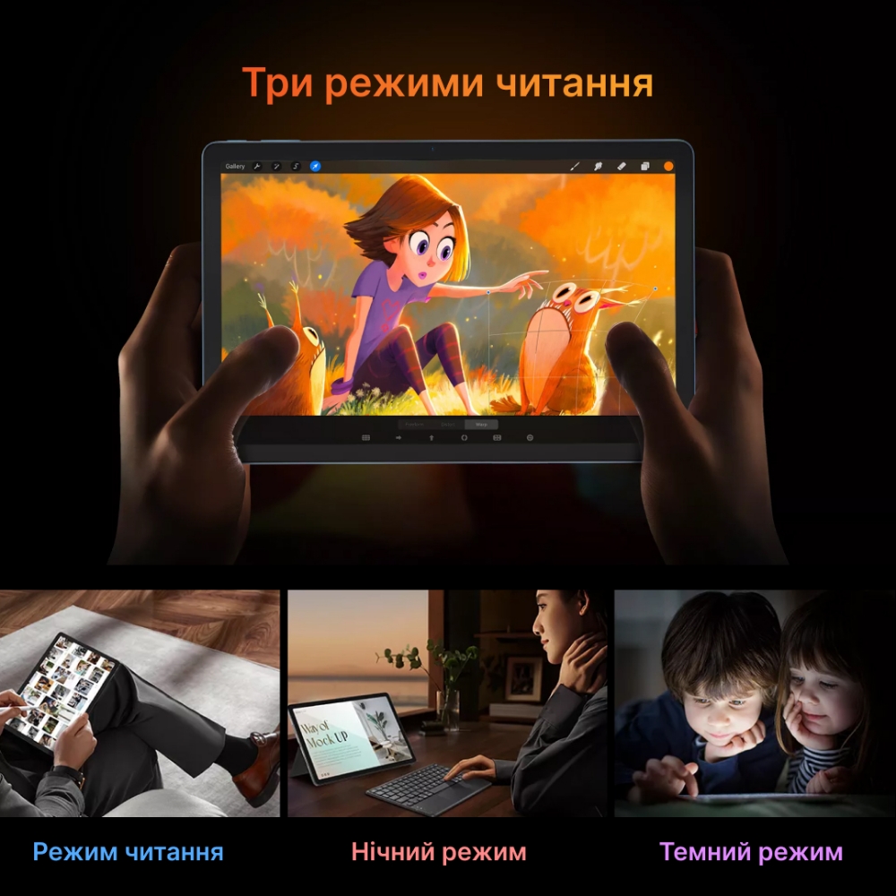 Oscal Pad 16 пропонує три спеціалізовані режими читання — Режим читання, Нічний режим та Темний режим — для оптимізації комфорту зору і мінімізації втоми очей. Режим розділеного екрана є ідеальним для багатозадачності, дозволяючи користувачам працювати з декількома додатками одночасно, підвищуючи продуктивність і ефективність.