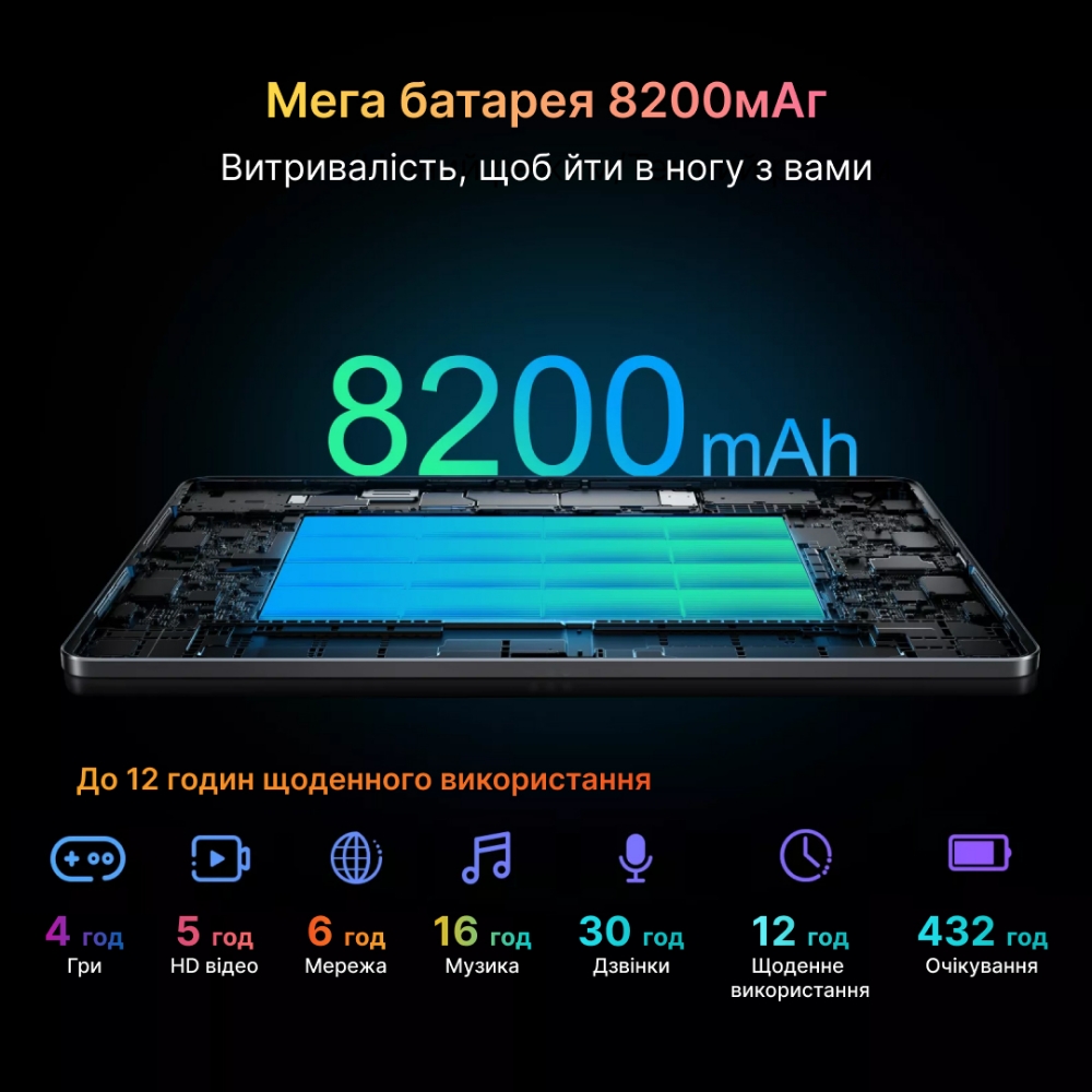 Oscal Pad 16 втілює новий рівень витривалості зі своїм вражаючим мега-акумулятором на 8200 мАг. Цей потужний енергетичний ресурс гарантує понад 12 годин активного використання, дозволяючи вам залишатися в русі та продуктивними без необхідності частого підзаряджання. Завдяки технології швидкої зарядки 18 Вт, Pad 16 забезпечує швидке відновлення енергії, знижуючи час простою та максимізуючи ваші можливості для роботи, навчання або ігор.