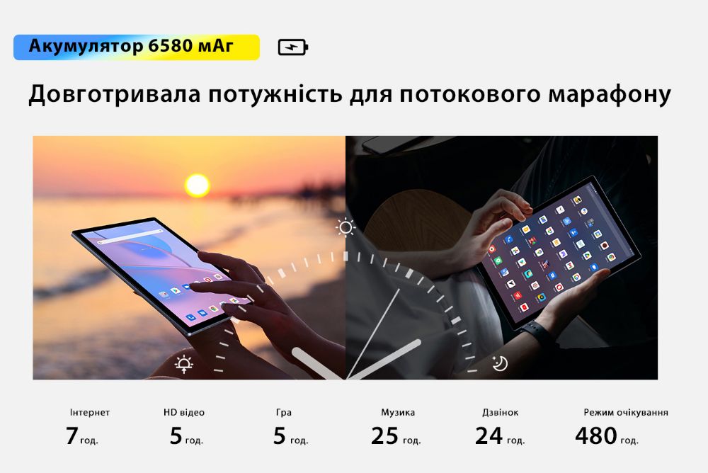 Акумулятор високої місткості 6580 мАг дозволить вам дивитися відео та працювати довше, ніж ви очікували. Він пропонує 5 годин відтворення відео та 7 годин перегляду вебсторінок.