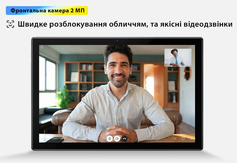 Фронтальна камера 2 МП дозволяє спілкуватися з родиною, друзями та колегами по роботі. А розумніша та швидша функція розблокування обличчям дозволяє просто підняти планшет і поглянути на нього, щоб миттєво розблокувати.