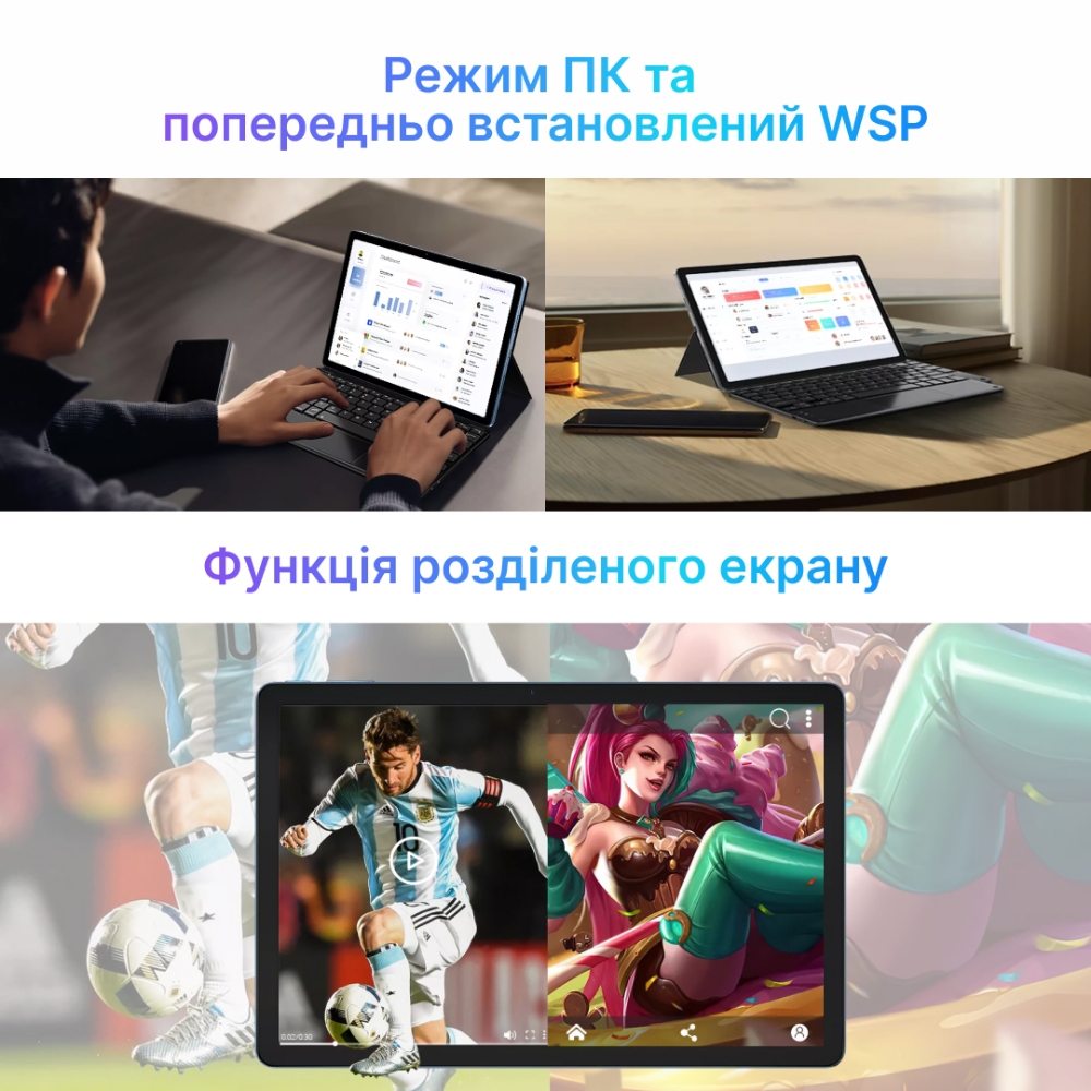 Режим ПК та функція розділеного екрана на Pad 18, разом з попередньо встановленим WPS Office, забезпечують зручність в роботі, дозволяючи легко перемикатися між завданнями та підвищувати продуктивність.