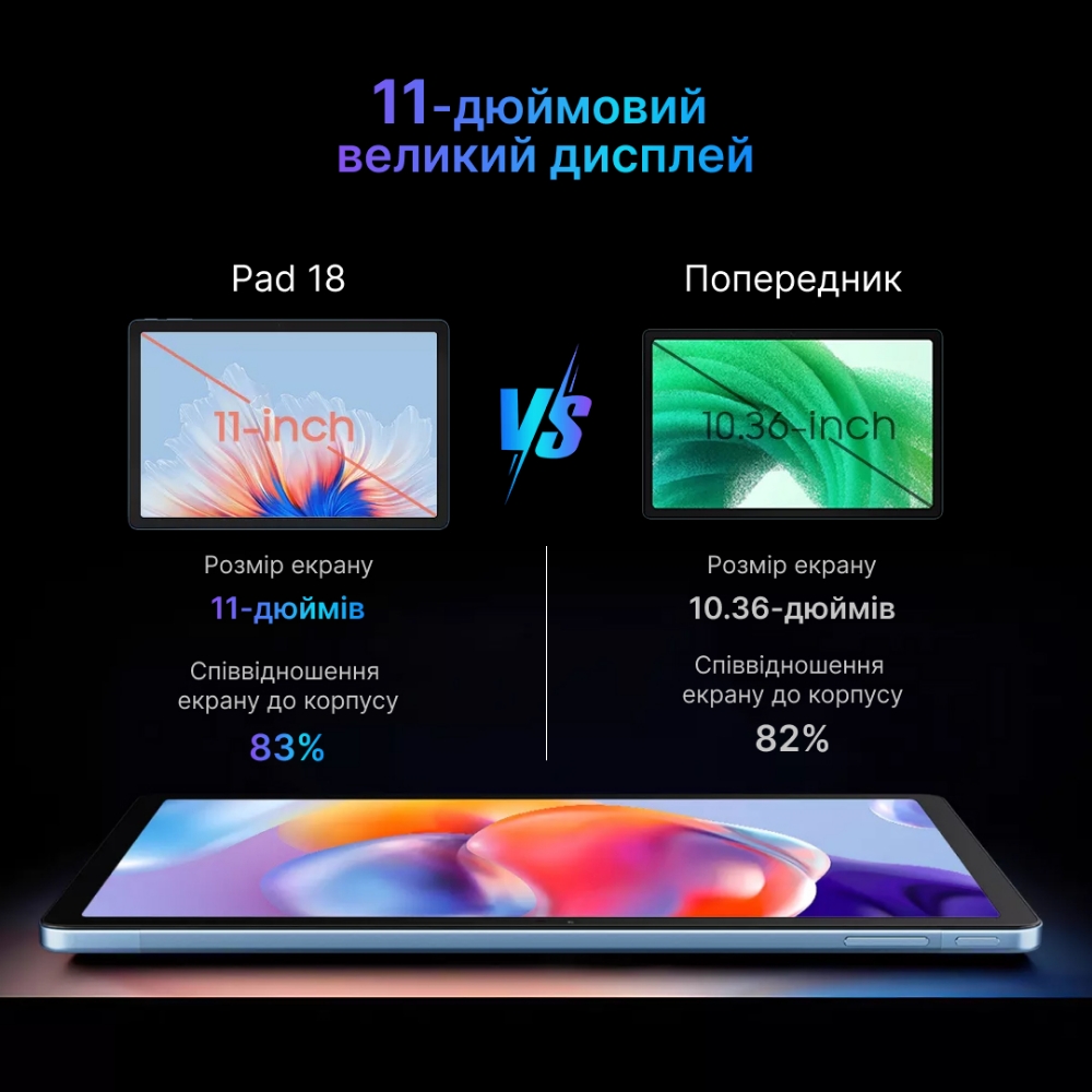 Екран Pad 18 відрізняється яскравістю та чіткістю зображення. Технології забезпечують більш насичені кольори і глибші чорні відтінки порівняно з попередніми моделями. Великий 11-дюймовий дисплей з широкими кутами огляду розкриває нові горизонти для роботи та розваг.