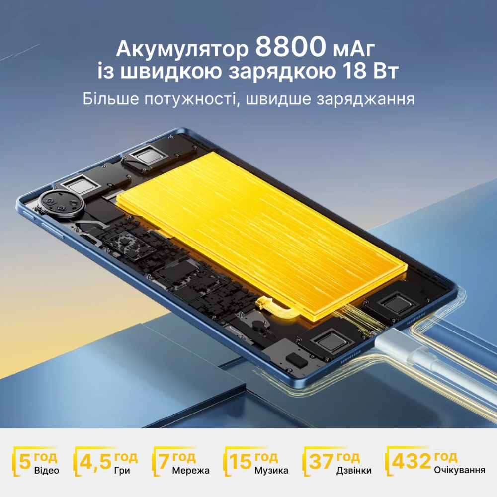 Завдяки місткості акумулятора 8800 мАг та швидкій зарядці 18 Вт, Pad 18 пропонує до 10 годин активного використання. Це означає, що ви можете проводити цілий день поза домом, не турбуючись про необхідність підзарядки.