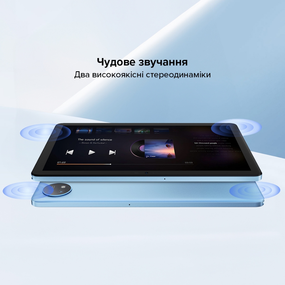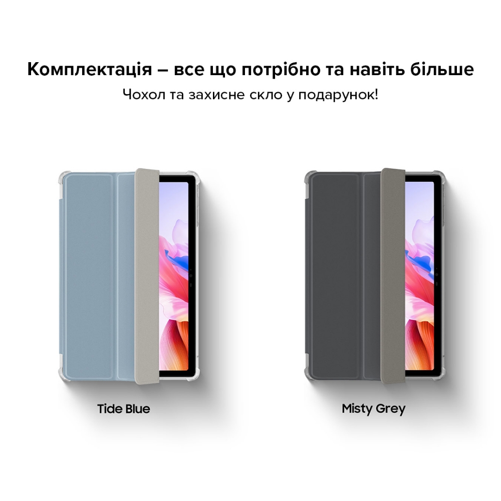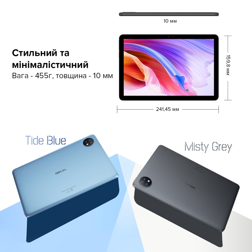 Планшет виконаний в мiнiмалiстичному та привабливому дизайні. Поєднує в собі невелику вагу – 455г та компактний корпус, товщиною – 10мм, шириною – 159,8мм та довжиною – 241,45мм. Представлений у двох стильних кольорах на вибір: Tide Blue та Misty Grey.