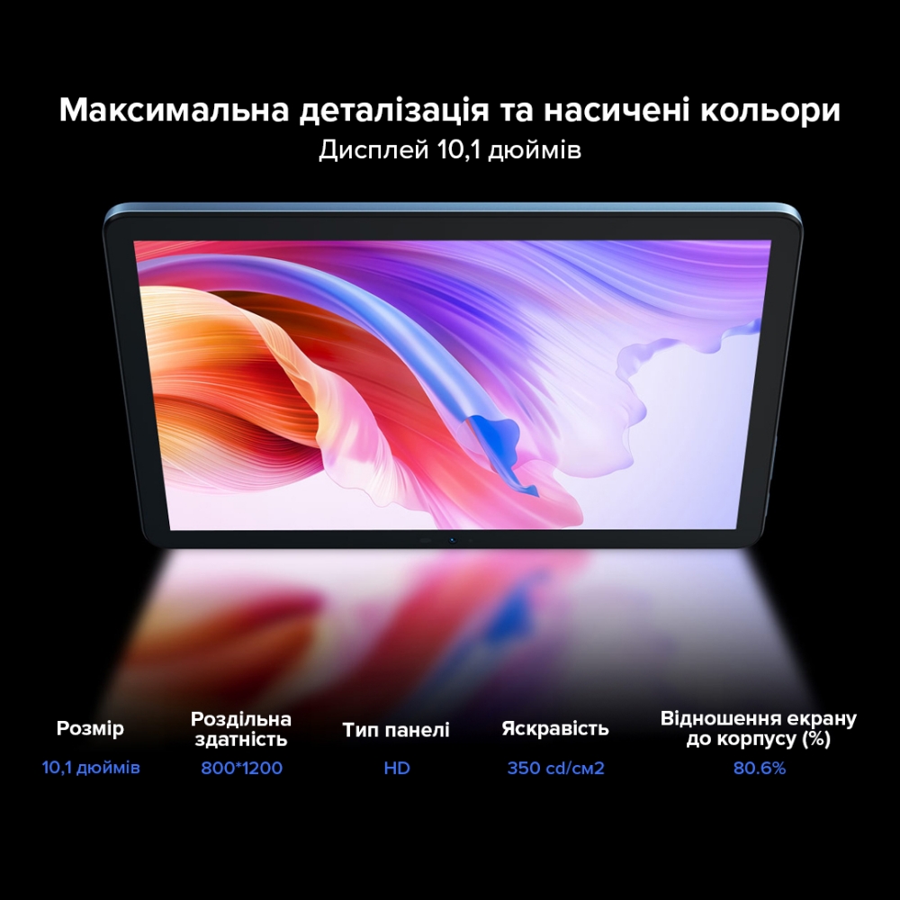 Оснащений 10,1-дюймовим HD+ дисплеєм з роздільною здатністю 800 х 1200 пікселів, що забезпечує яскравість до 350 (кд/м2) та реалістичну передачу кольорів. Pad 7 ідеальний для перегляду фільмів, серіалів, контенту із соціальних мереж, ігор, а також читання та відеодзвінків. Має оптимальне співвідношення площі дисплея до корпусу 80% – жодних випадкових торкань.