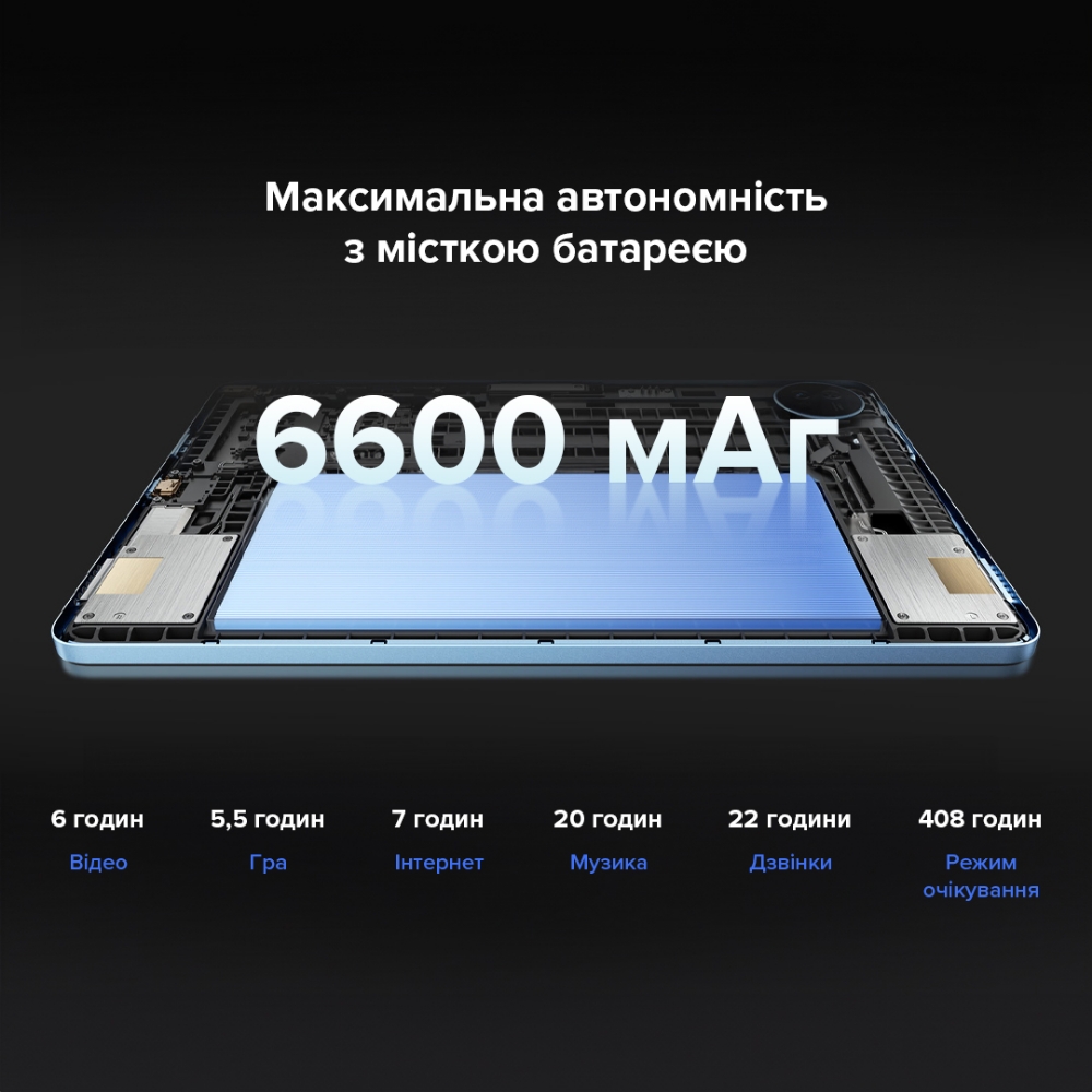 Завдяки Li-on батареї на 6600 мАг, Pad 7 дозволяє насолоджуватися автономною роботою в різних сценаріях використання: до 408 годин у режимі очікування, 22 години дзвінків, 20 годин музики, 7 годин веб-серфінгу, 6 годин відео та 5 годин ігор.