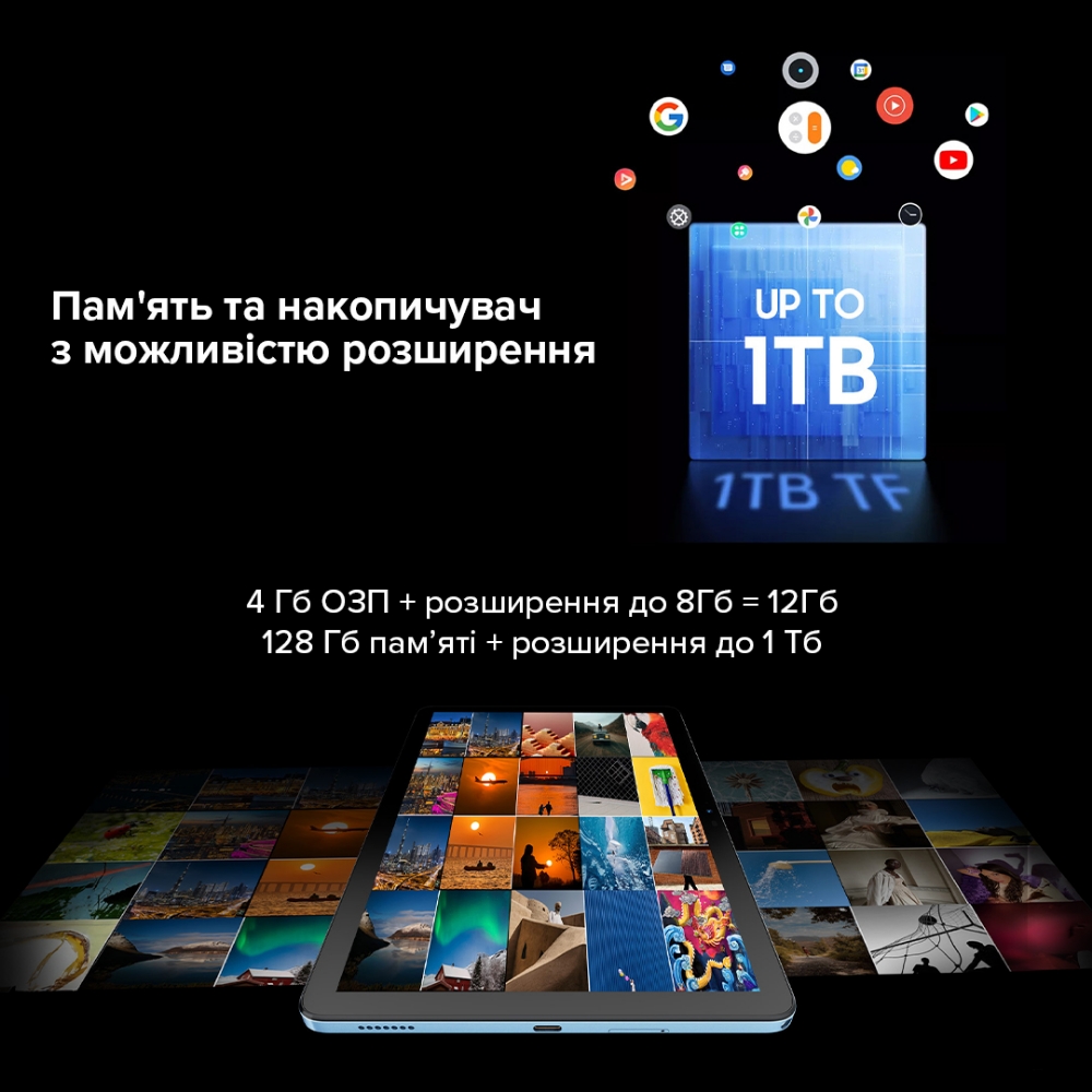 Пристрій має 4 Гб оперативної пам'яті з підтримкою розширення + 8 Гб віртуальної пам'яті, до 12 Гб ОЗУ. Прискорюй планшет для роботи в багатозадачному режимі, відкривай безліч веб-сторінок, паралельно слухай музику та грай із задоволенням.