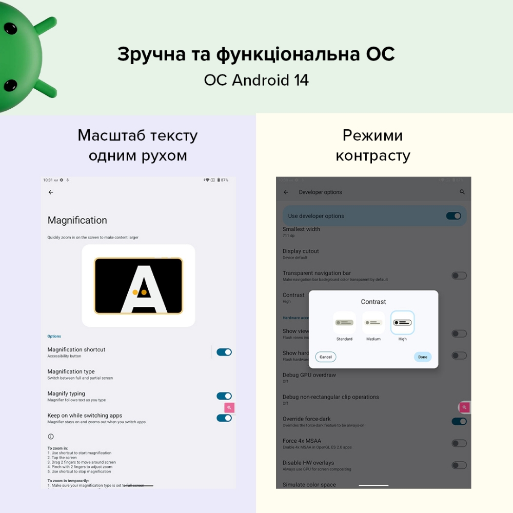 Встановлена ОС Android 14, яка робить управління Oscal Pad 7 максимально зручним. Масштабуй текст на весь екран одним рухом, настроюй контрастність під свій зір або вибирай стандартні налаштування для швидкого старту.