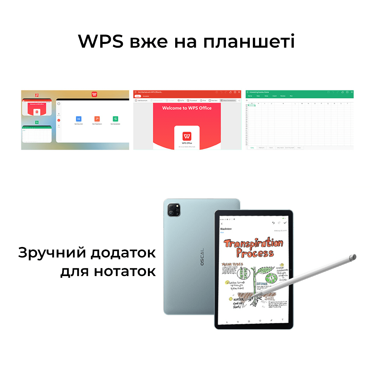 На Oscal Pad 70 встановлено пакет офісних додатків WPS, тому ви відразу можете використовувати його для роботи з текстами, таблицями та презентаціями. Все так само легко та зручно, як і на звичайному комп'ютері.