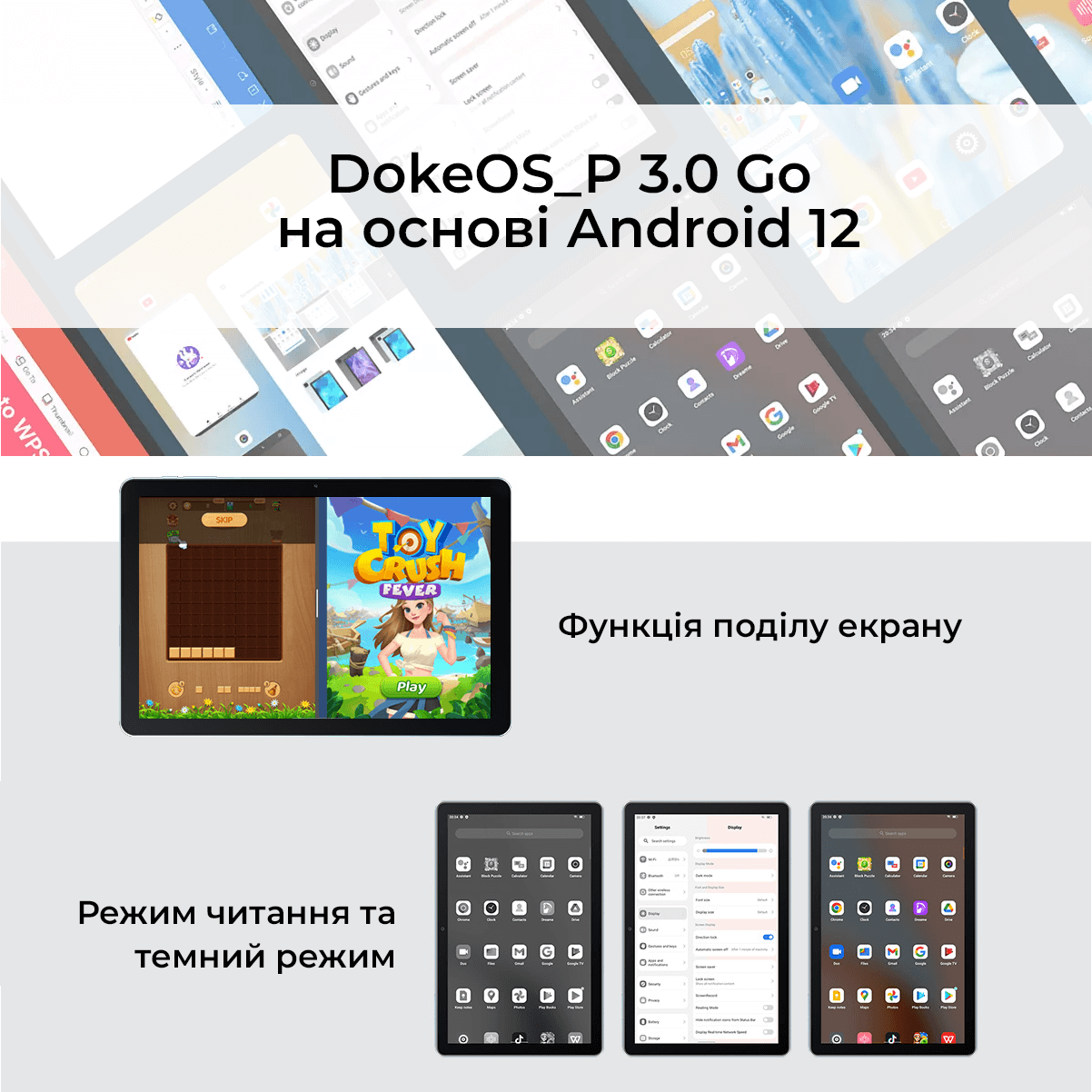 DokeOS_P 3.0 Go на основі Android 12 – це сучасна операційна система, якою зручно користуватися, адже вона зрозуміла навіть на інтуїтивному рівні. Ви швидко звикнете до неї і зможете познайомитися з її фішками, які полегшать роботу на пристрої. Чого тільки варті «чарівні жести». Проведіть пальцем вниз по дисплею, перед вами відкриється панель керування. У меню, що випадає, є кнопки для знімка екрана, відключення звуку, перемикання між дзвінками. Натиснувши на регулювання гучності, ви відкриєте спливаюче вікно праворуч. Тепер ви можете налаштувати будильник, звук, сповіщення. Зверніть увагу на анімацію під час появи спливаючих вікон та скріншотів, вона плавна та швидка.