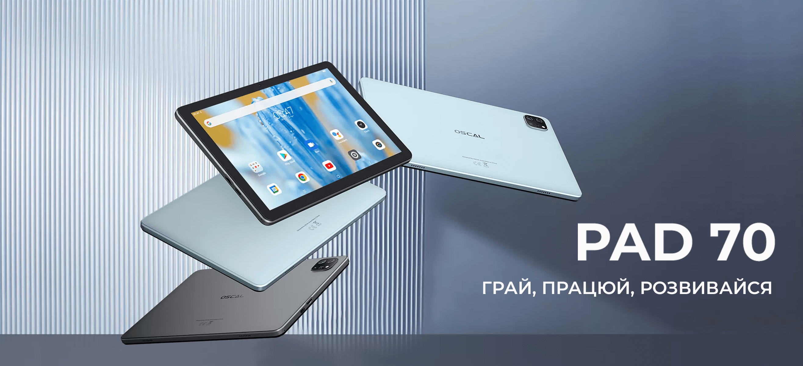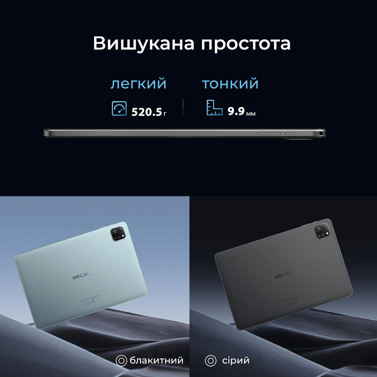 Дизайн планшета Oscal Pad 70 можна описати двома словами – вишукана простота. Товщина корпусу – 9,9 мм, а вага – 520,5 г. Симетрія рами та заокруглення кутів додають пристрою елегантності та комфортності у застосуванні. Користувачі мають вибір між двома кольорами: Misty Blue і Meteorite Grey.