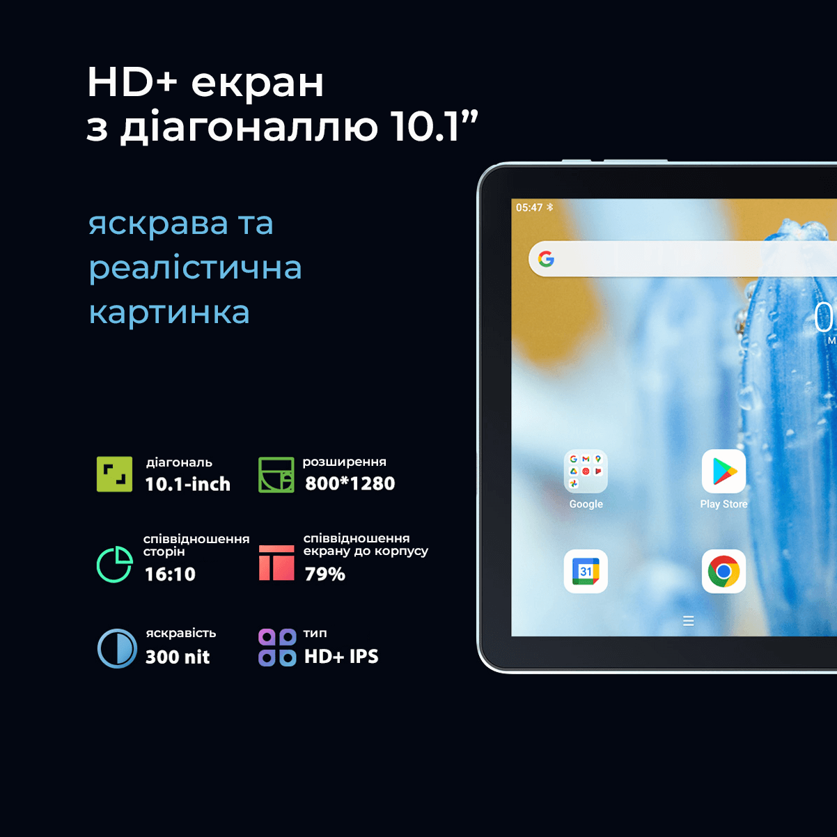 Планшети з HD+ екранами з діагоналлю 10.1 дюйми є найпопулярнішими. На них зручно дивитися фільми, грати в ігри, читати, працювати, здійснювати відеодзвінки.У Oscal Pad 70 не тільки великий, але і якісний дисплей з роздільною здатністю 800 * 1280, яскравістю 300 нит.