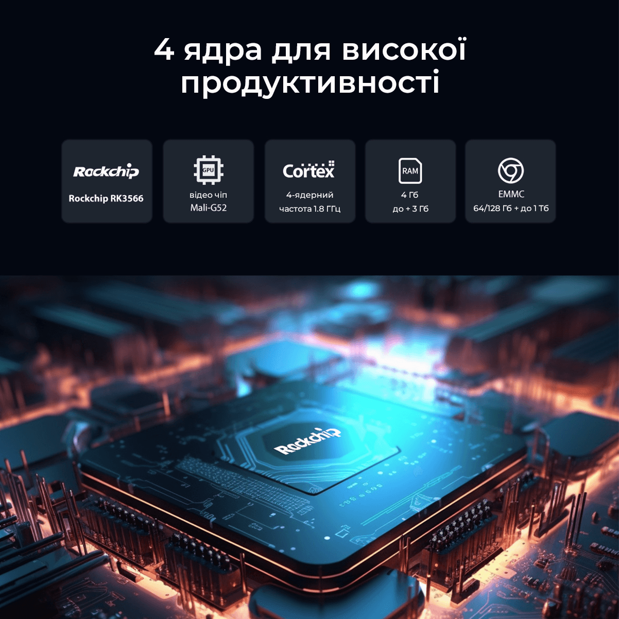 Усередині планшета встановлений 4-ядерний процесор Quad-core Rockchip RK3566 із частотою 1,8 ГГц. Завдяки йому Oscal Pad 70 перетворюється на ідеальний інструмент для розваг та роботи. Він має високу продуктивність, навіть коли вам потрібно виконувати на девайсі кілька завдань одночасно.