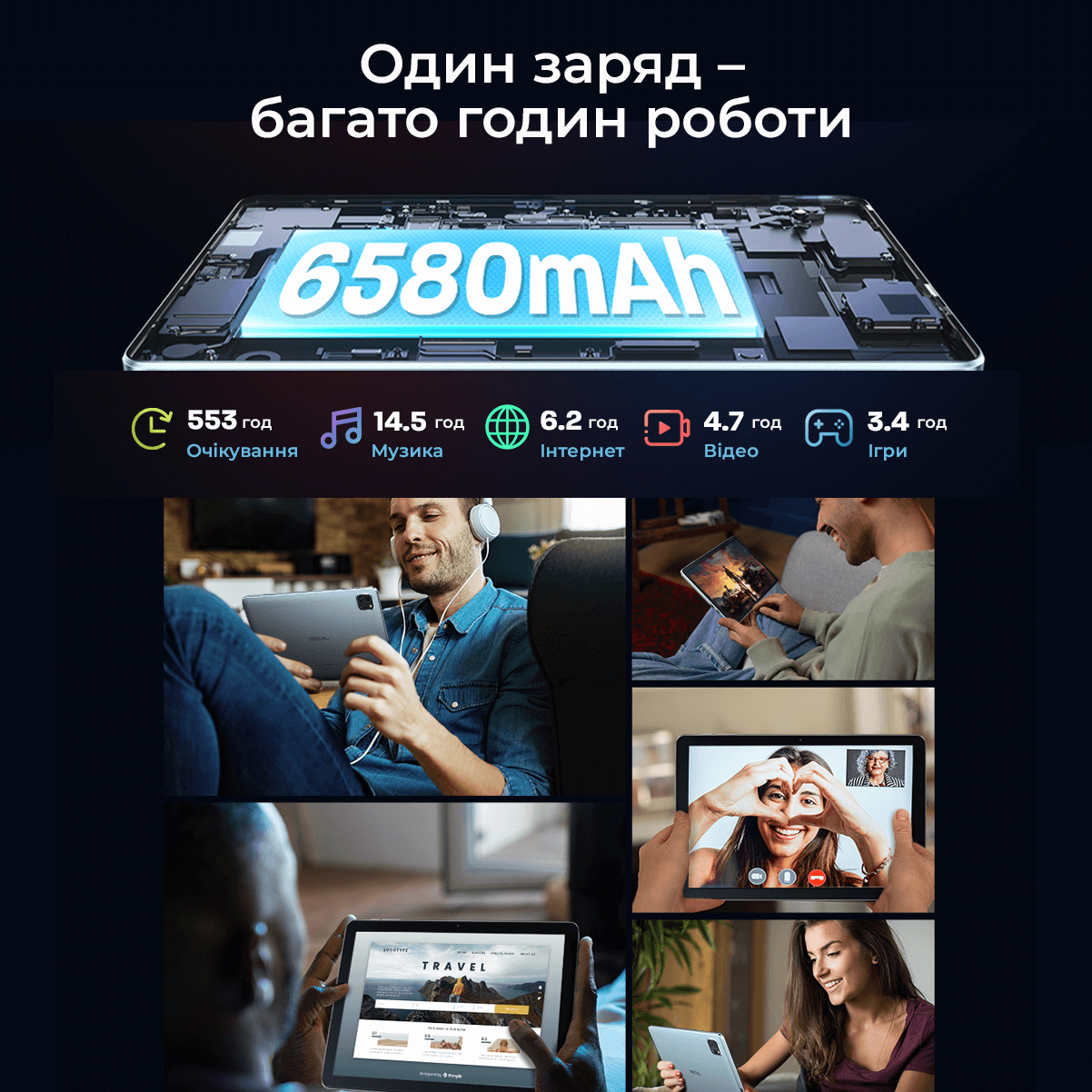 На скільки вистачить акумулятора 6580 мАг? На 4,7 години перегляду улюблених фільмів, на 3,4 години захоплюючого геймплею, на 6,2 години інтернет-серфінгу, на 14,5 годин прослуховування музичних треків. Планшет може перебувати в режимі очікування до 55 годин.