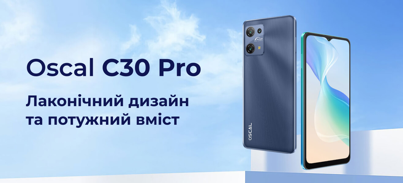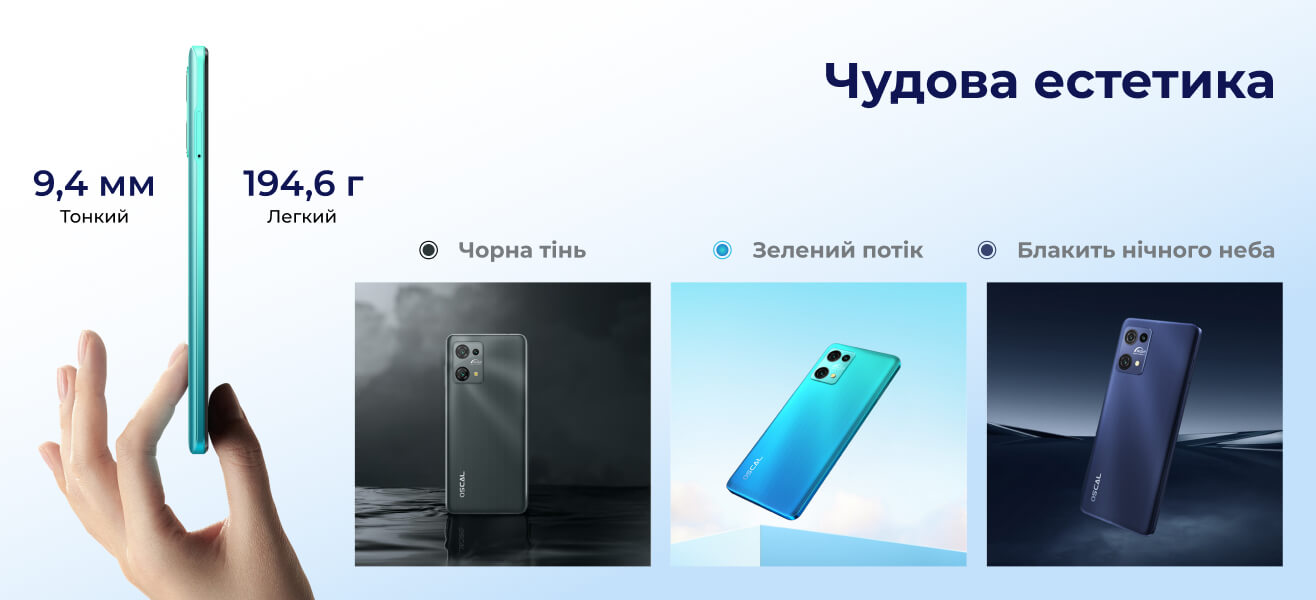 Тонкий корпус (всього 9,4 мм) та вага 194,6 г роблять цю модель телефону улюбленою для багатьох користувачів. Унікальний малюнок на задній поверхні смартфона нанесений за допомогою лазерного гравіювання. Завдяки цьому створюється чарівний кольоровий градієнт. Oscal C30 Pro представлений у трьох колірних рішеннях: чорна тінь, зелений потік та синьова нічного неба.