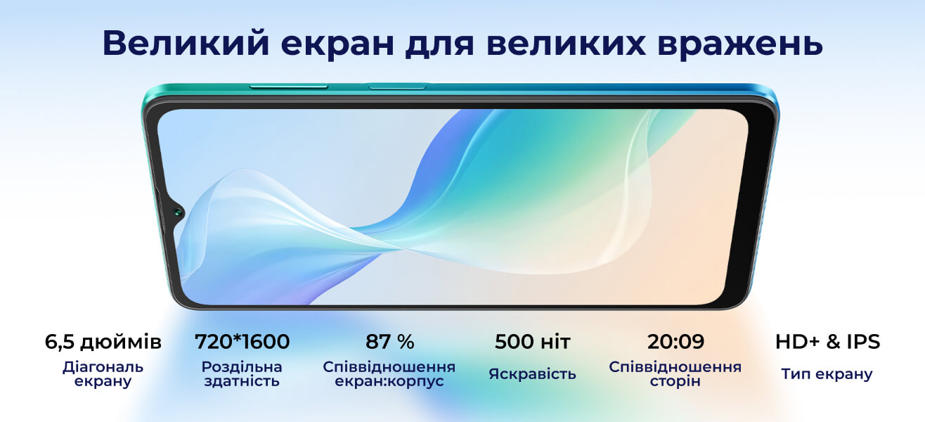 В Oscal C30 Pro використовується 6,5” екран HD+ Incell. Він відправить вас у захоплюючу візуальну подорож просторами Youtube, TikTok, Instagram. На ньому зручно дивитися фільми, тим більше, що дисплей має приголомшливу передачу кольору. Екран займає 87% простору корпусу, його яскравість становить 500 нит.