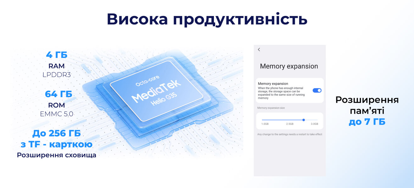 Вбудовану оперативну пам'ять 4 Гб можна збільшити до 7 Гб, а внутрішнє сховище 64 Гб розширюється за рахунок TF-карти ще на 256 Гб. Тепер запуск одночасно кількох програм не буде проблемою, а ігровому процесу нічого не заважатиме.