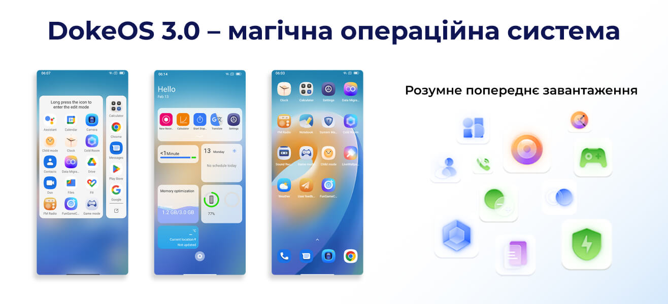 Операційна система DokeOS 3.0 покликана зробити вашу взаємодію зі смартфоном більш простою та захоплюючою. Ви можете групувати піктограми до папок, блокувати робочий стіл, налаштувати значки. У системі передбачено кілька тем робочого столу, що надихають: вихор, цвітіння, ефір.