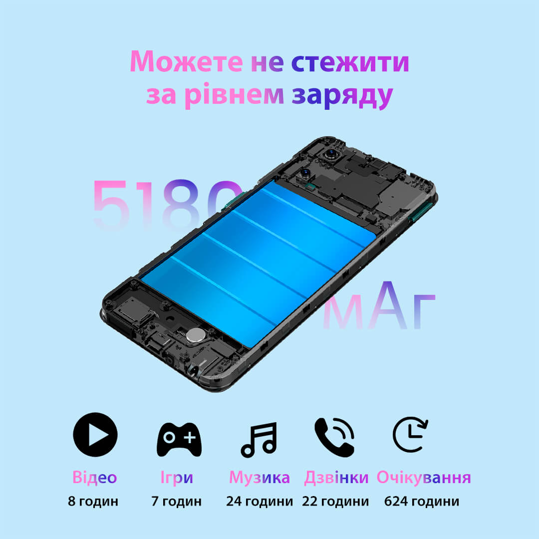 Завдяки акумулятору на 5180 мАг ви можете не боятися, що телефон розрядиться в самий невідповідний момент. Повністю зарядженої батареї вистачить на 24 години прослуховування музики, 7 годин ігор, 8 годин перегляду відео, 22 години дзвінків, 624 години в режимі очікування.
