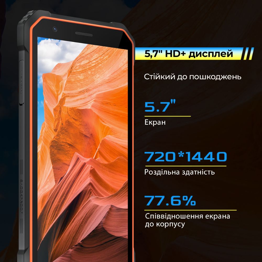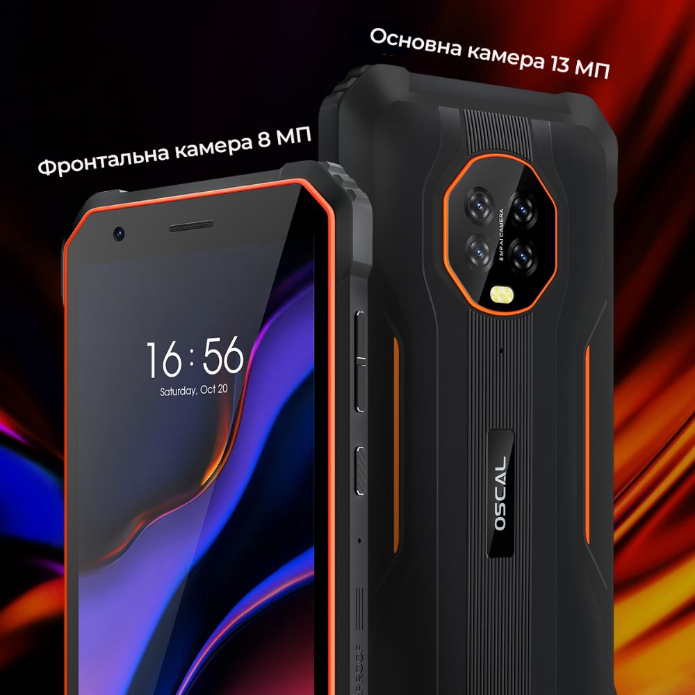 Смартфон Oscal S60 Pro 4/32GB Dual Sim Orange; 5.7" (1440х720) IPS / MediaTek Helio A25 / ОЗУ 4 ГБ / 32 ГБ вбудованої + microSD до 1 ТБ / камера 13 Мп + 8 Мп / 4G (LTE) / Bluetooth, Wi-Fi, NFC / GPS, A-GPS, GLONASS, Beidou, Galileo / ОС Android 11.0 / 161.7x78.5x14 мм, 255 г / 5580 мАг / чорно-помаранчевий