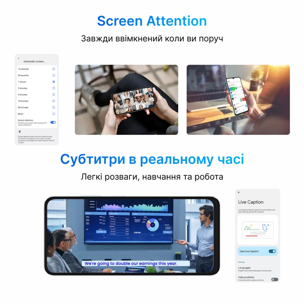 Функція Screen Attention зберігає дисплей активним, коли ви дивитеся на нього, оптимізуючи активність акумулятора. Субтитри в реальному часі трансформують ваш досвід перегляду відео, забезпечуючи зручність як у роботі, так і в навчанні.