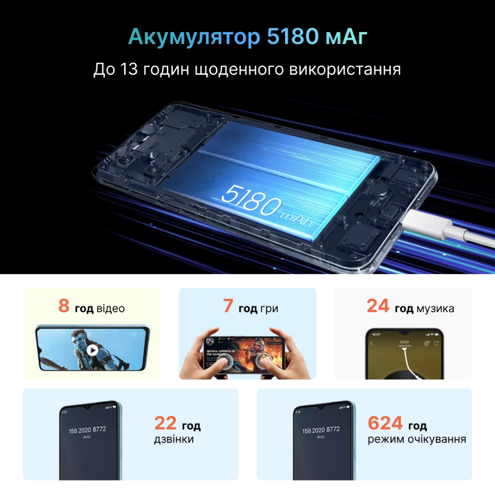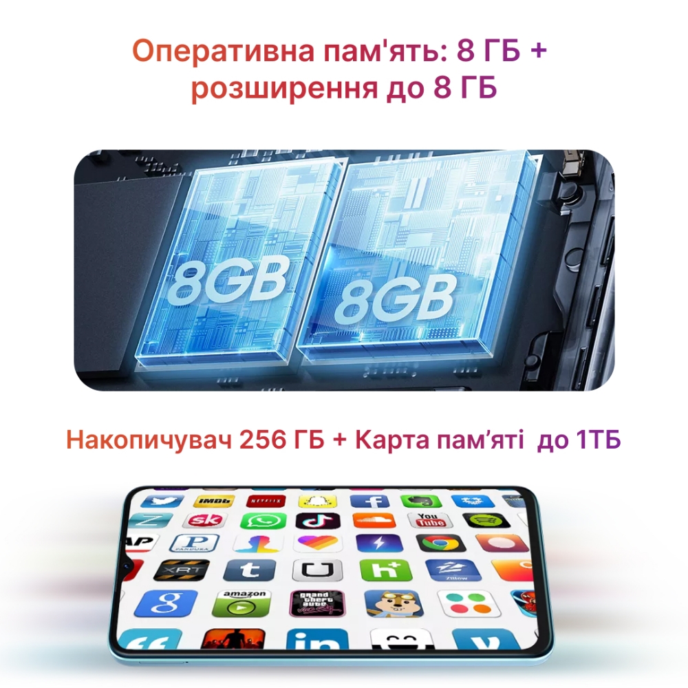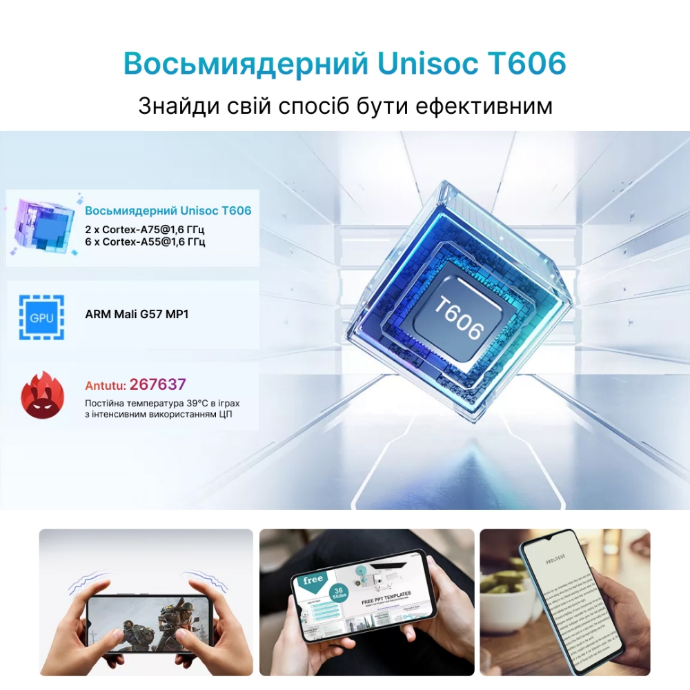 Unisoc T606 з 2 x Cortex-A75 та 6 x Cortex-A55 ядрами 1,6 ГГц кожне, підкріплений графічним прискорювачем ARM Mali G57 MP1, забезпечує вражаючу продуктивність у вашій долоні. Тест Antutu підтверджує: 267637 балів – це про швидкість і можливості.