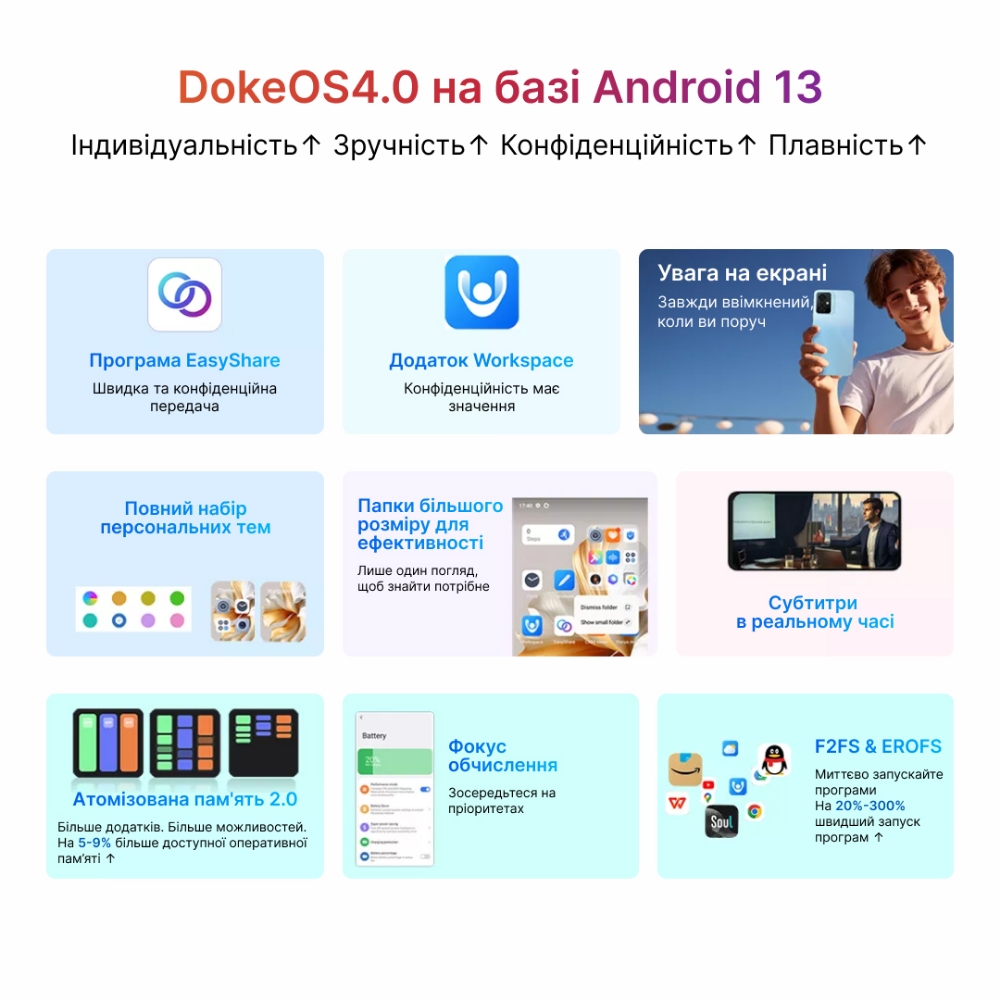 DokeOS 4.0 на базі Android 13, це ваш засіб до інтуїтивної, ефективної та безпечної взаємодії. Смартфон, що має вбудований EasyShare для швидкого обміну даними, враховує ваше право на конфіденційність та надає новітній досвід користування технологіями.