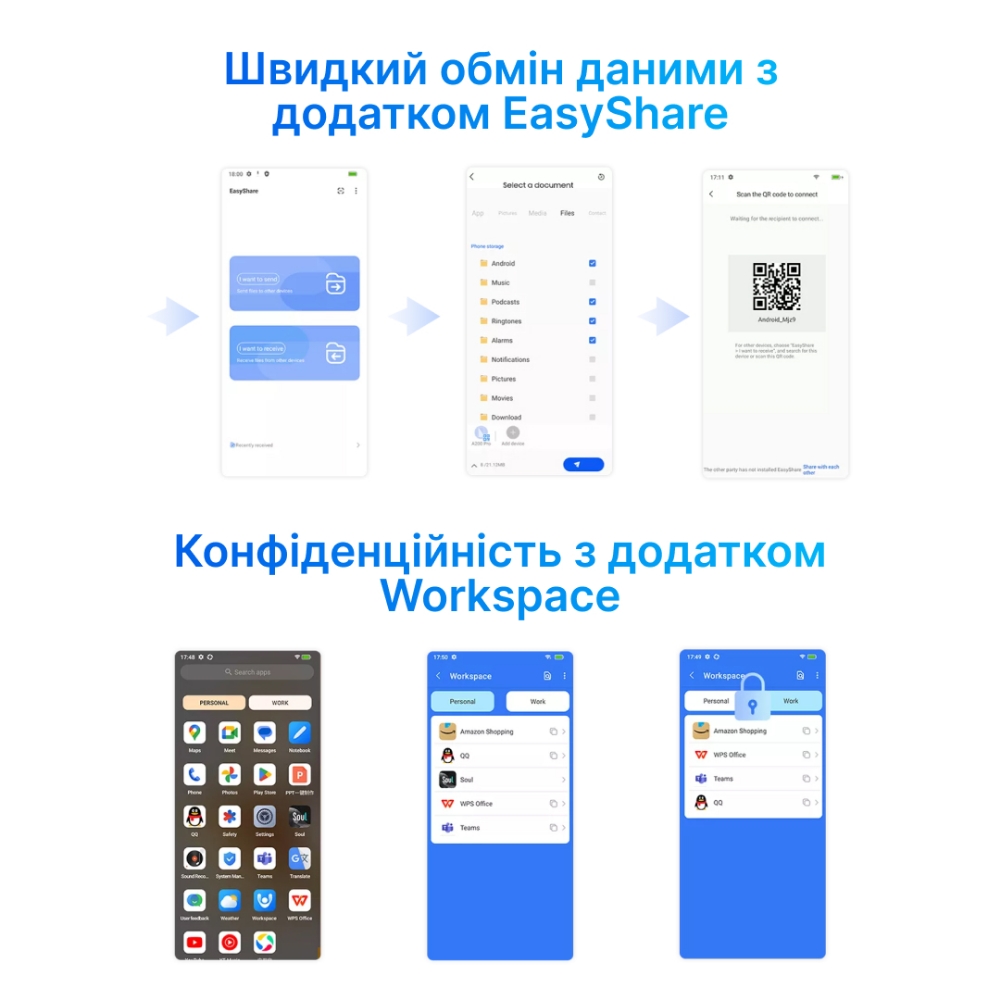 Миттєво обмінюйтесь документами та медіа з EasyShare, насолоджуючись швидкістю до 7,7 МБ/с. Додаток Privacy Matters створює роздільні робочі простори для вашого бізнесу і особистого життя, підносячи приватність на новий рівень.