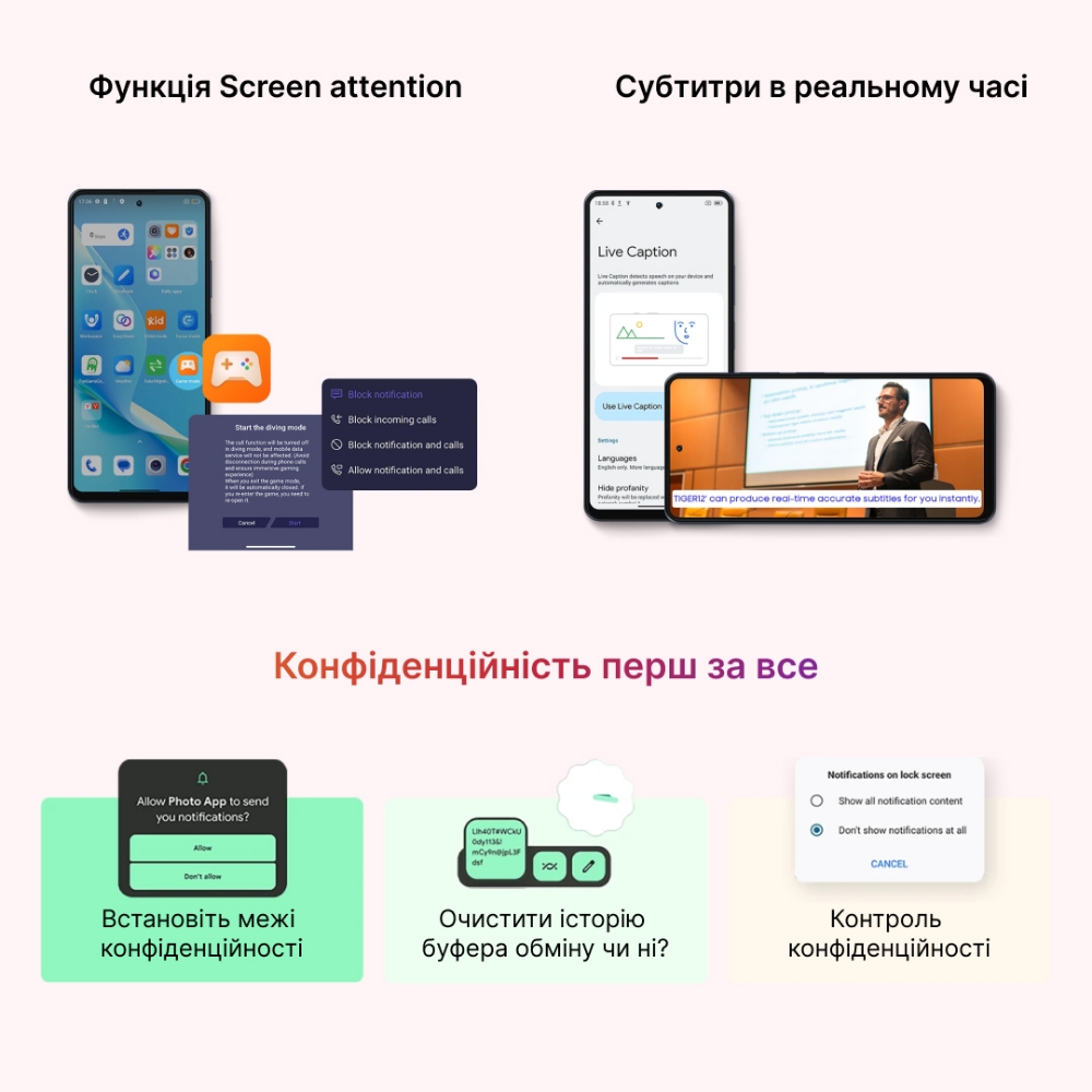 Функція "Увага до екрана" в Oscal TIGER 12 автоматично підтримує активність екрана під час користування, а розширені налаштування конфіденційності та субтитри в реальному часі підвищують безпеку та зручність користувачів.