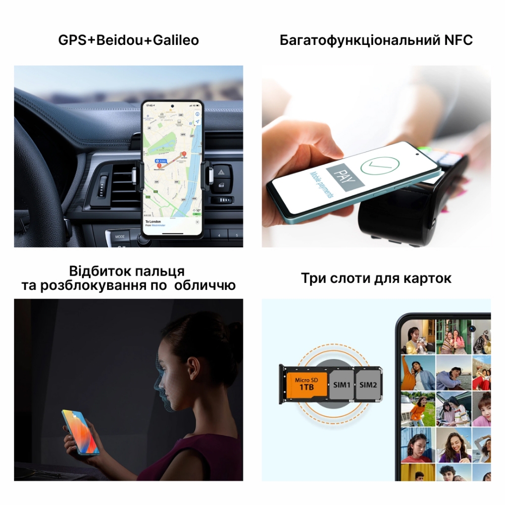 Oscal TIGER 12 підтримує NFC для зручних безконтактних платежів. Смартфон пропонує два методи розблокування для підвищення безпеки: сканера обличчя та датчик відбитків пальців. Потрійний слот для карт забезпечує гнучкість використання, а вбудовані системи GPS, ГЛОНАСС, Beidou і Galileo гарантують точність навігації.