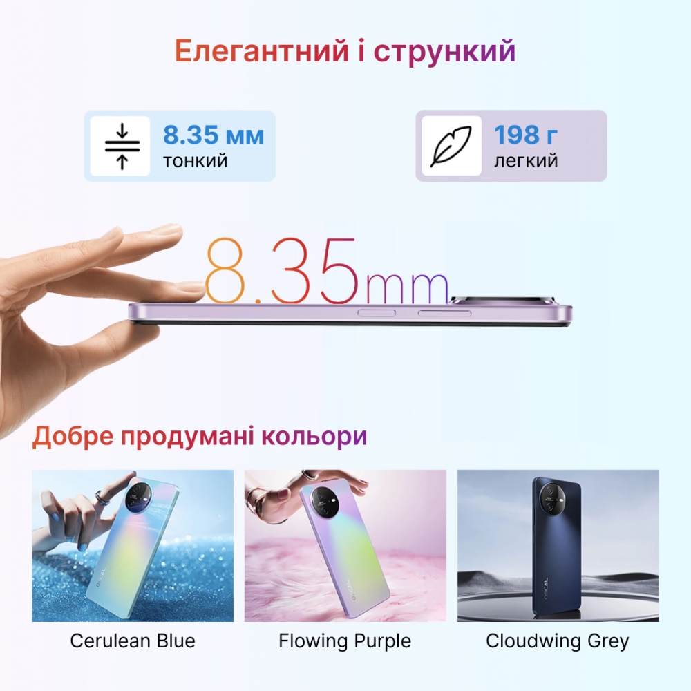 Модель Oscal TIGER 12 вирізняється своїм тонким (8,35 мм) та легким (198 г) корпусом, доступним у трьох стильних кольорах: небесно-блакитний, струменистий фіолетовий, хмарно-сірий. Це поєднання дизайну та ергономіки робить смартфон ідеальним вибором для користувачів, які цінують стиль та зручність.