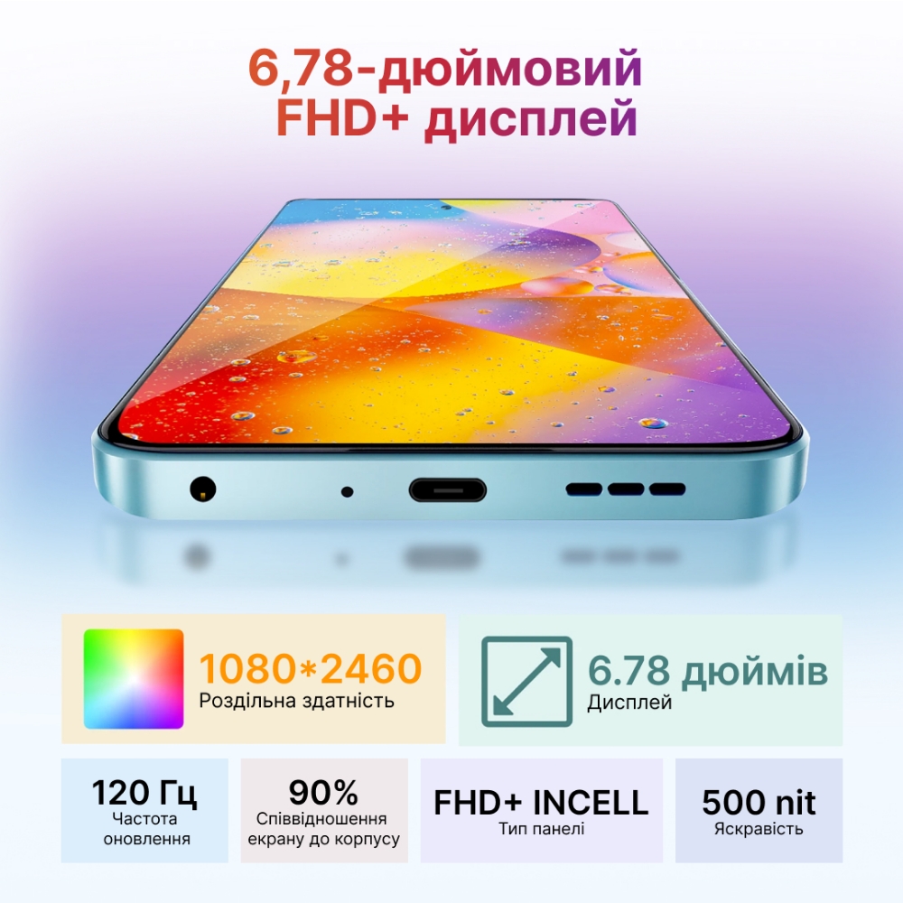 Оснащений 6,78-дюймовим FHD+ дисплеєм із частотою динамічного оновлення до 120 Гц, Oscal TIGER 12 забезпечує надзвичайну якість зображення з плавними переходами, високою чіткістю та відмінним кутом перегляду, що є важливим для потокового відео, ігор та інших мультимедійних застосунків.