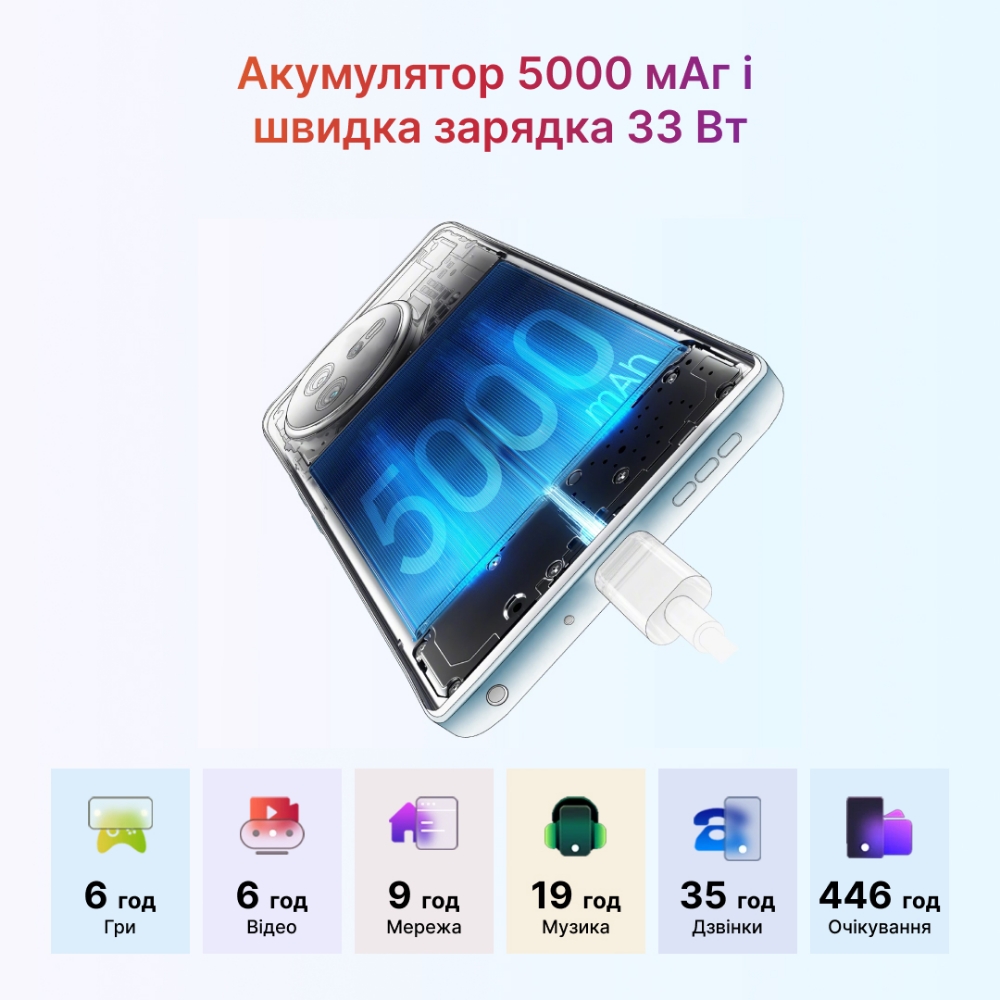 Завдяки акумулятору місткістю 5000 мАг та підтримці швидкої зарядки 33 Вт, Oscal TIGER 12 гарантує тривалий час автономної роботи. Це забезпечує значну кількість енергії для ігор, перегляду відео та інших завдань, а також дозволяє швидко відновити заряд акумулятора.
